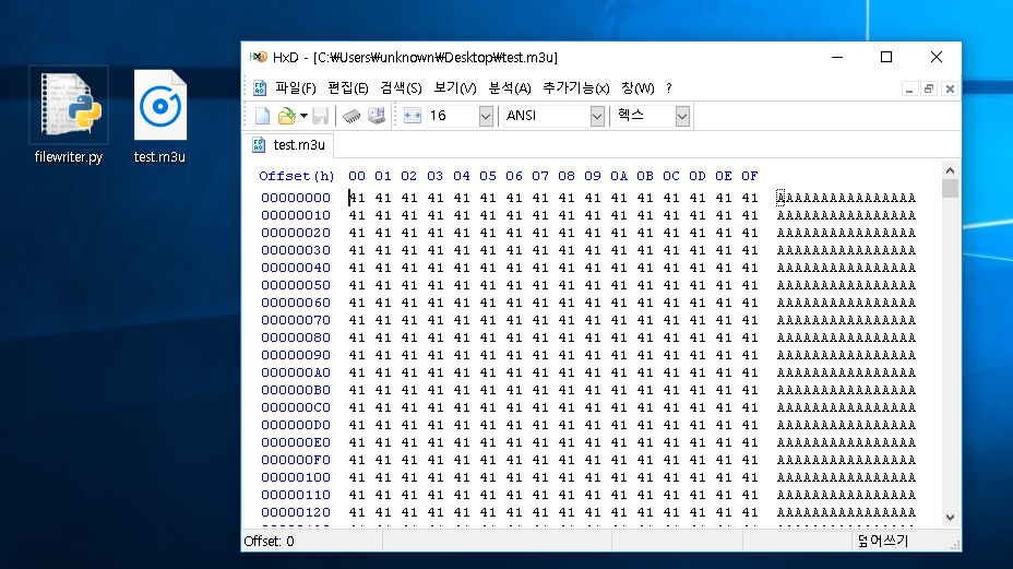 코드 작성후 실행시켜 10000개의 'A'(\x41)이 저장되있는 파일을 만들어 줬습니다.