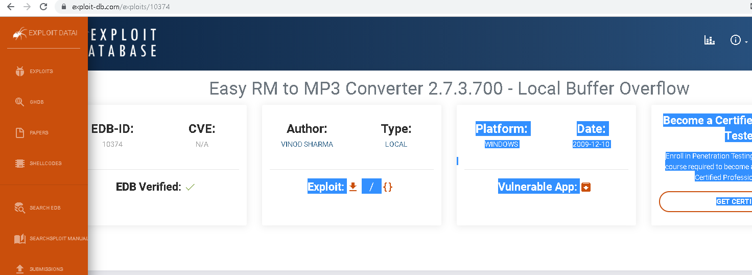 EXPLOIT DATABASE에 가시면 해당 취약점 정보와 취약한 버전의 프로그램을 받을 수 있습니다!