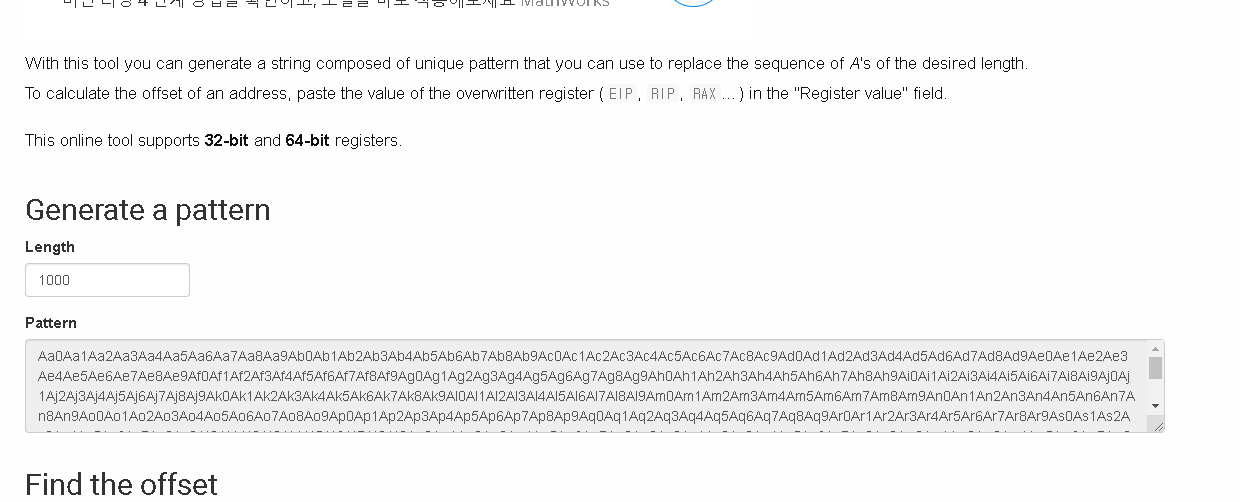 문서에서처럼 칼리리눅스가 있다면 pattern_offset.rb로 패턴을 생성해서 오프셋을 특정할 수 있습니다만 패턴생성과 탐색을 위해서 칼리를 쓰기에는 시간이 너무 많이 걸리므로 온라인 패턴 생성기를 사용하도록 하겠습니다. https://wiremask.eu/tools/buffer-overflow-pattern-generator/?