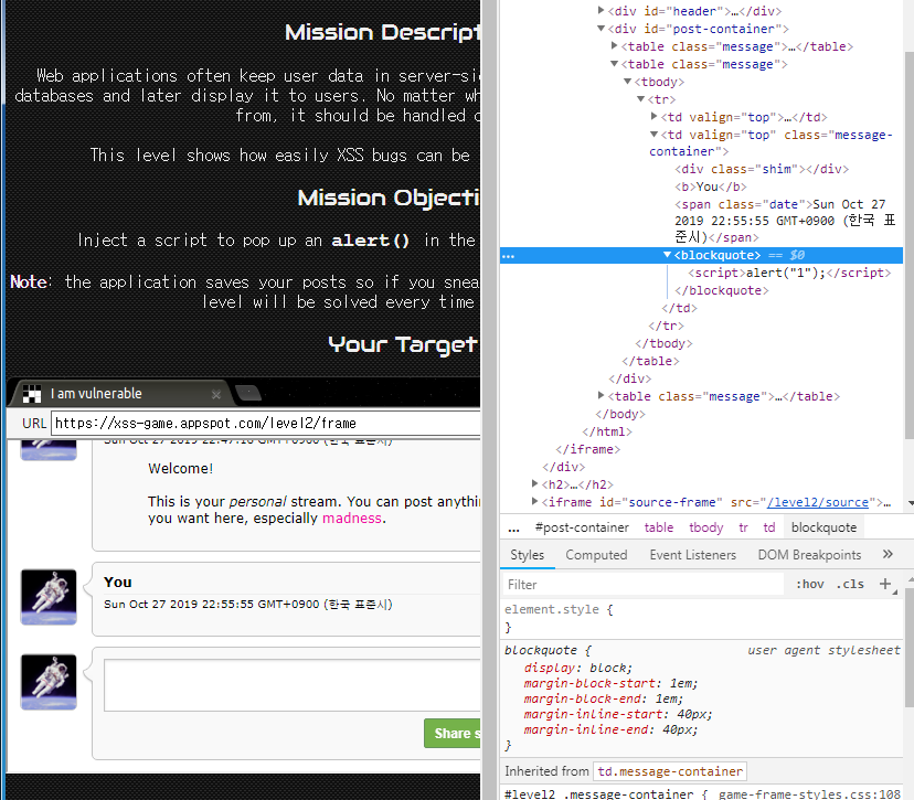 화면을 보니 필터링 됐는지 아무 입력도 보이지 않습니다! 요소검사로 해당 부분을 보니 스크립트가 <blockquote>태그안에 들어가 있군요...