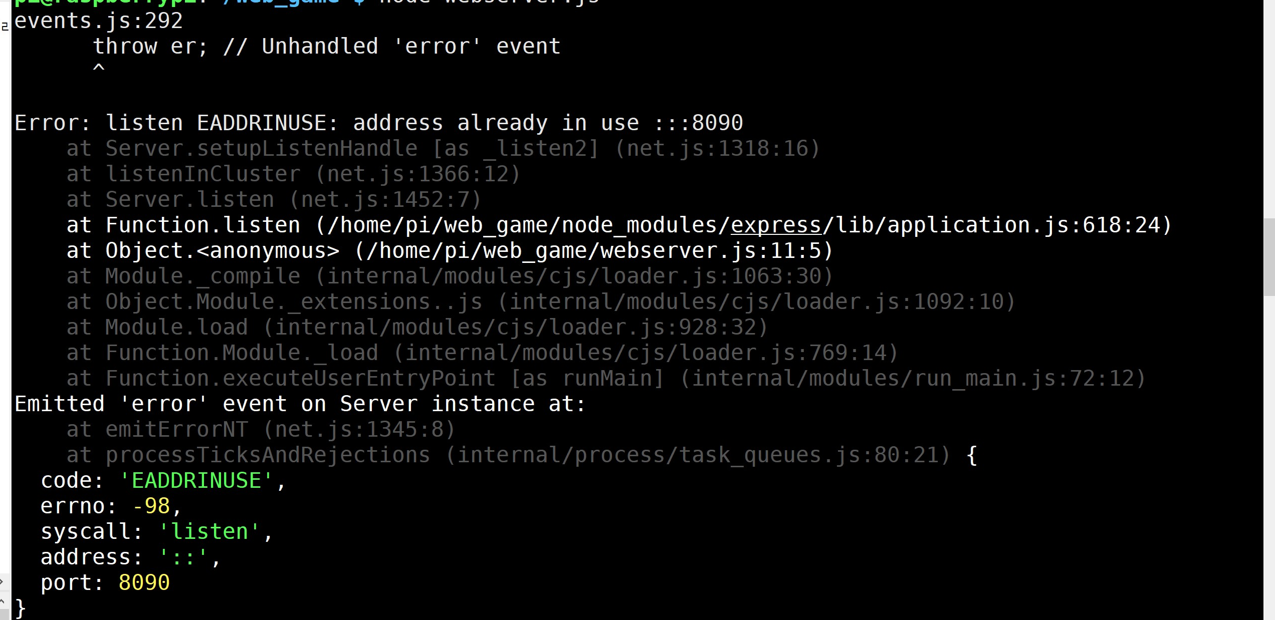 이는 비정상적으로 세션을 종료해서 아직 node.js가 실행중이어서 포트를 점유하고 있기 때문에 생기는 현상이다.