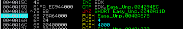 해당 코드는 총 6개의 BP를 걸어주었고 대략 3분 내외로 찾아낸것 같네요 마지막 JMP로 00401150으로 code영역으로 jmp하는게 보입니다.