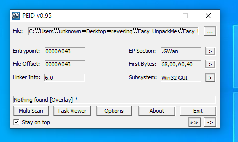 뭔가 패킹이 되어있을거 같은데 PEiD로는 딱히 탐지가 안되네요