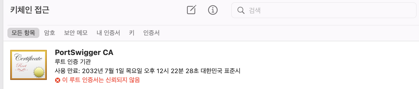 시스템 키체인에 등록 후 보면 기본적으로 신뢰되지 않음으로 설정되어있음