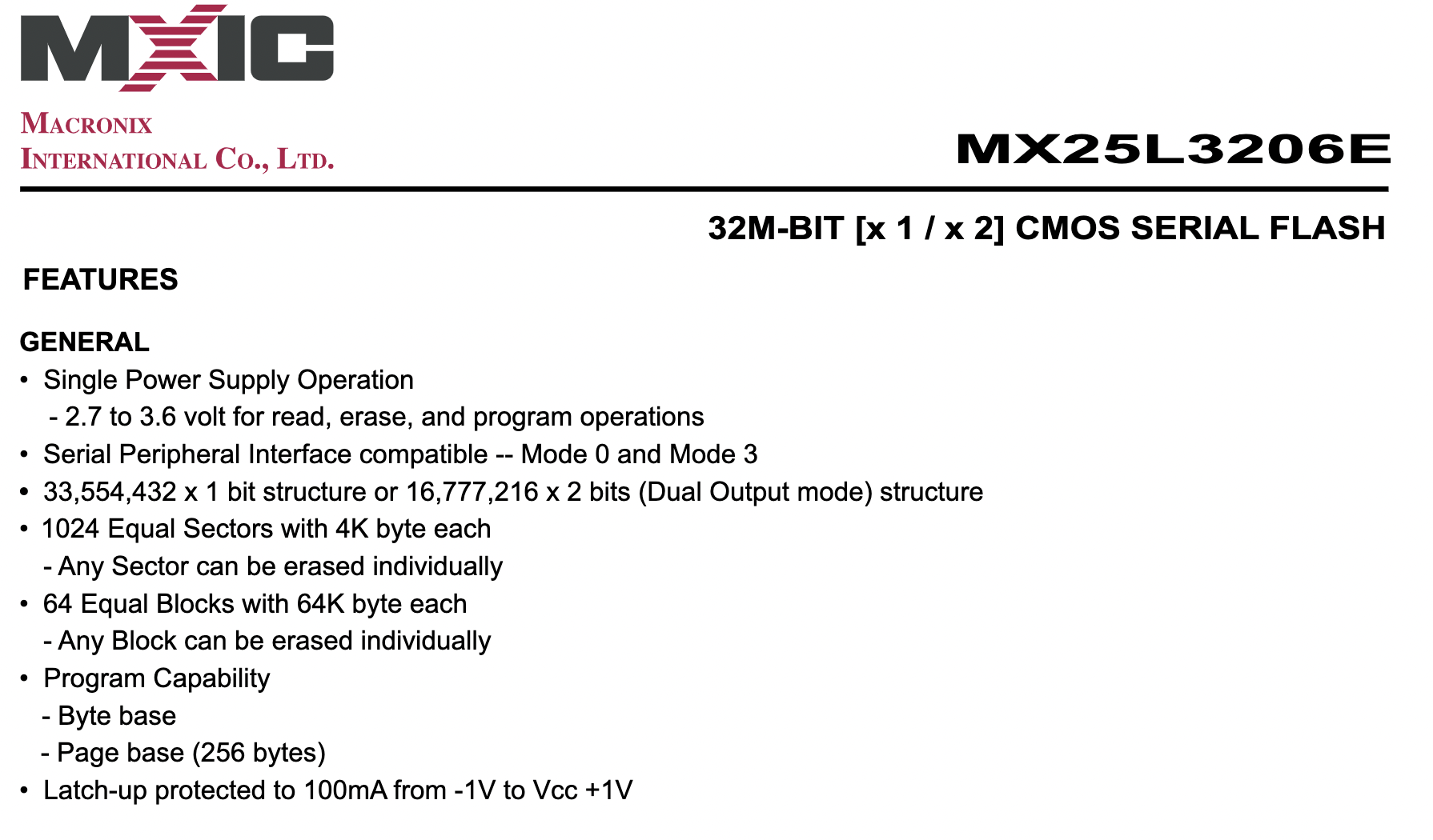 마찬가지로 데이터 시트를 확인해보니 32M-BIT CMOS 시리얼 플래시로 플래시 ROM이었네요!