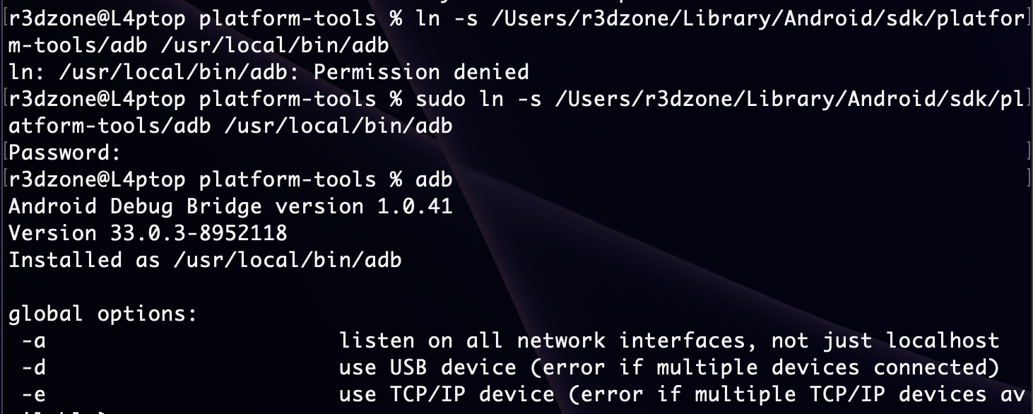 ln -s /Users/사용자명/Library/Android/sdk/platform-tools/adb /usr/local/bin/adb