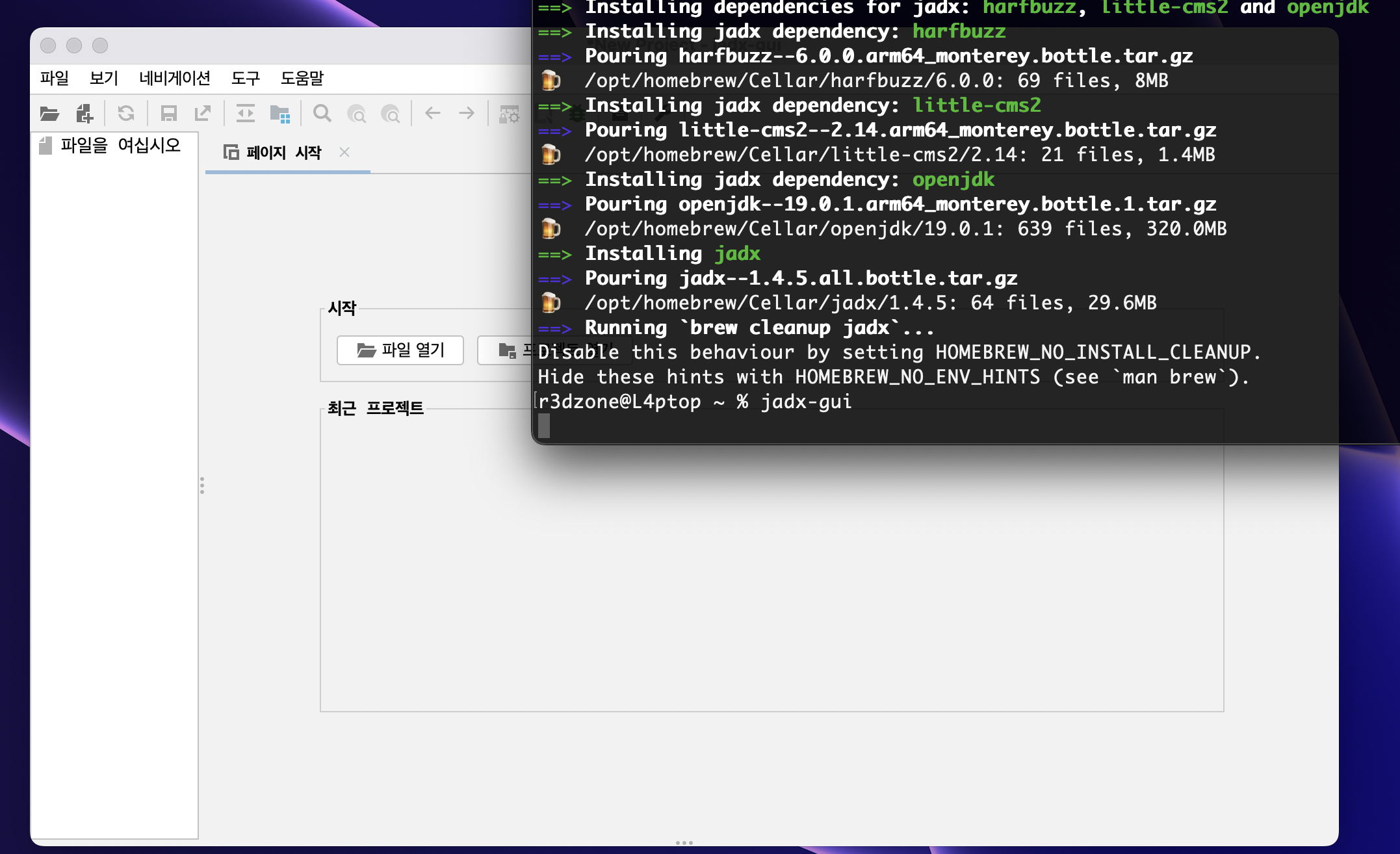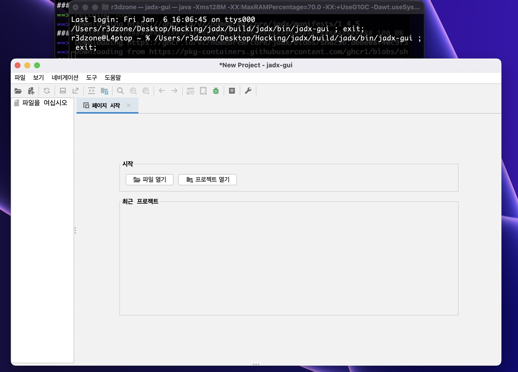 그럴경우 터미널이 열리며 자동으로 jadx가 실행됩니다.