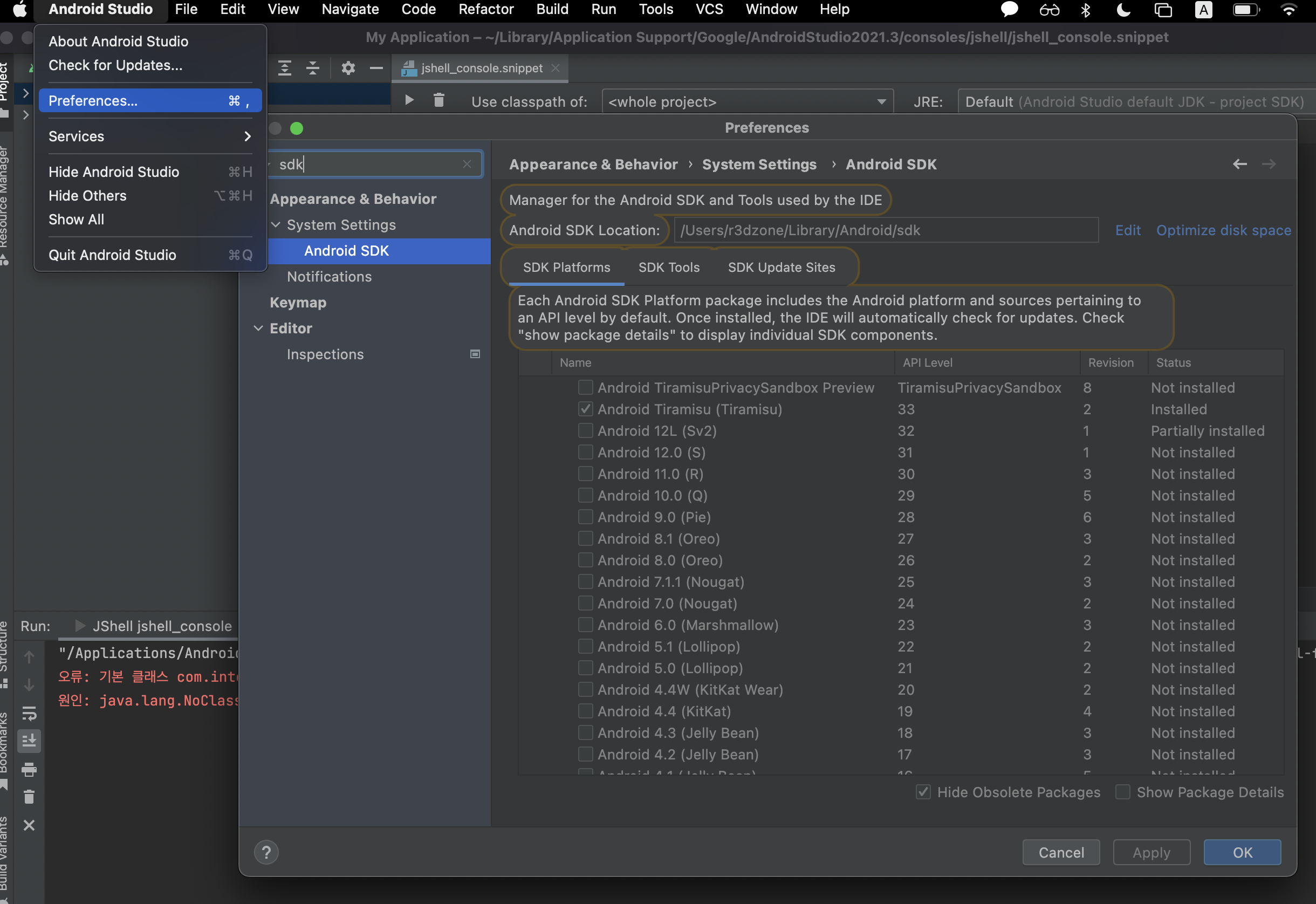 안드로이드 스튜디오 - Preferences 선택후 시스템 세팅 - 안드로이드 sdk를 가주시면 어느경로에 sdk툴이 있는지 어떤 툴들이 깔렸는지 확인 가능합니다.