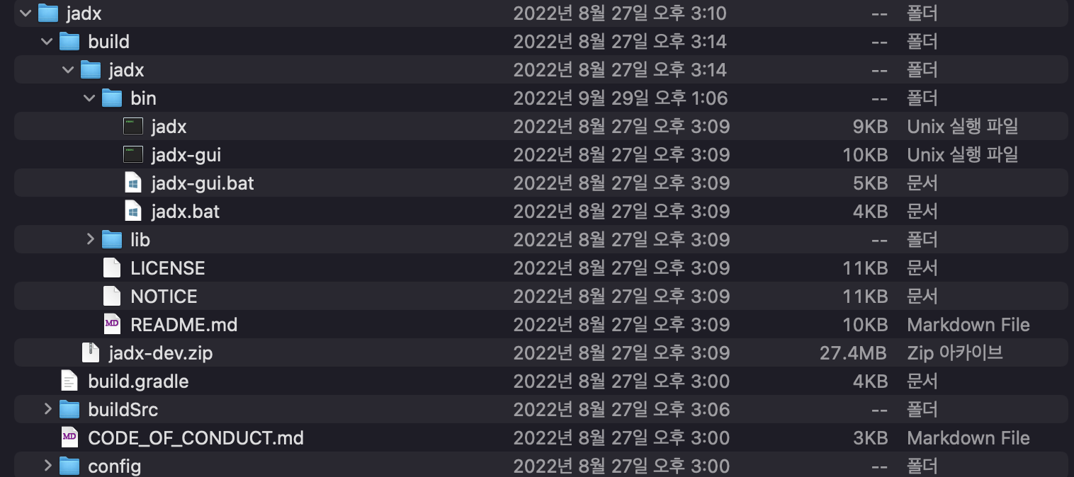 빌드를 받아주셨다면 받은 디렉토리에서 build/jadx/bin/jadx-gui를 실행시켜주면 됩니다.
