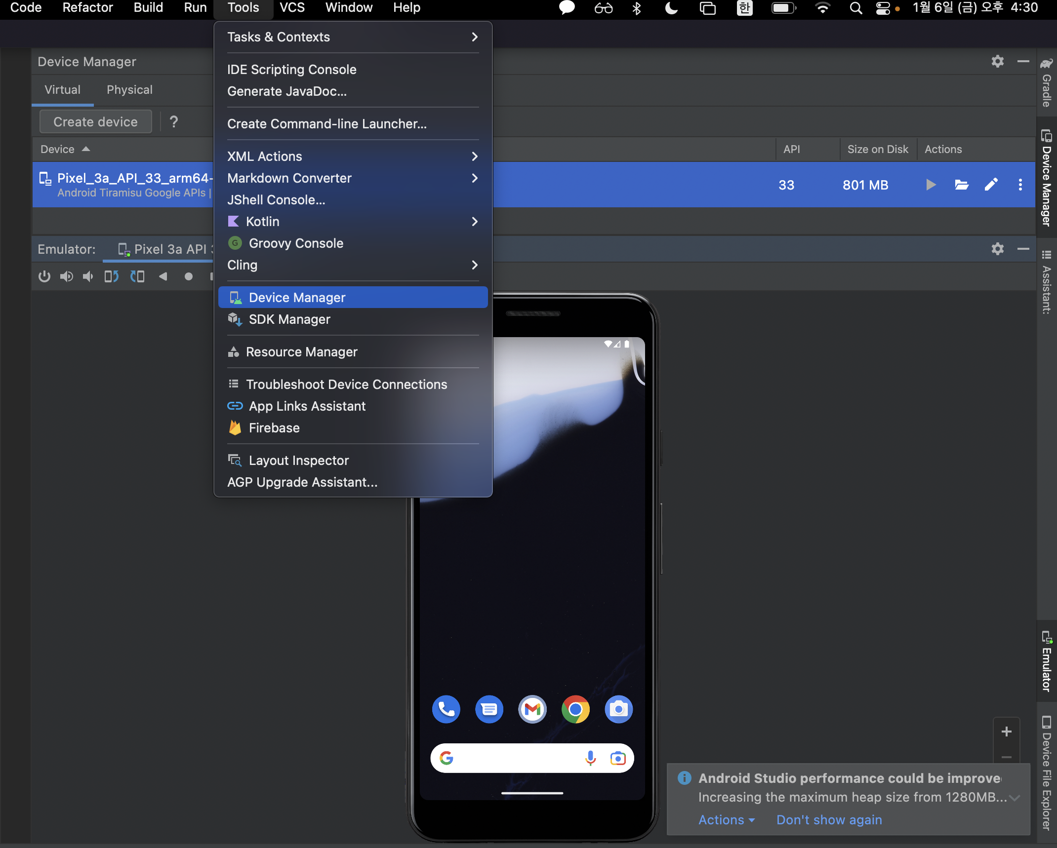 안드로이드 에뮬레이팅을 위한 avd나 adb를 설치해야합니다.