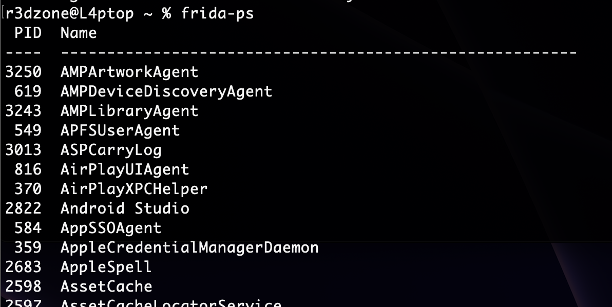 맥 터미널로 돌아와 frida-ps를 실행시켜보면
